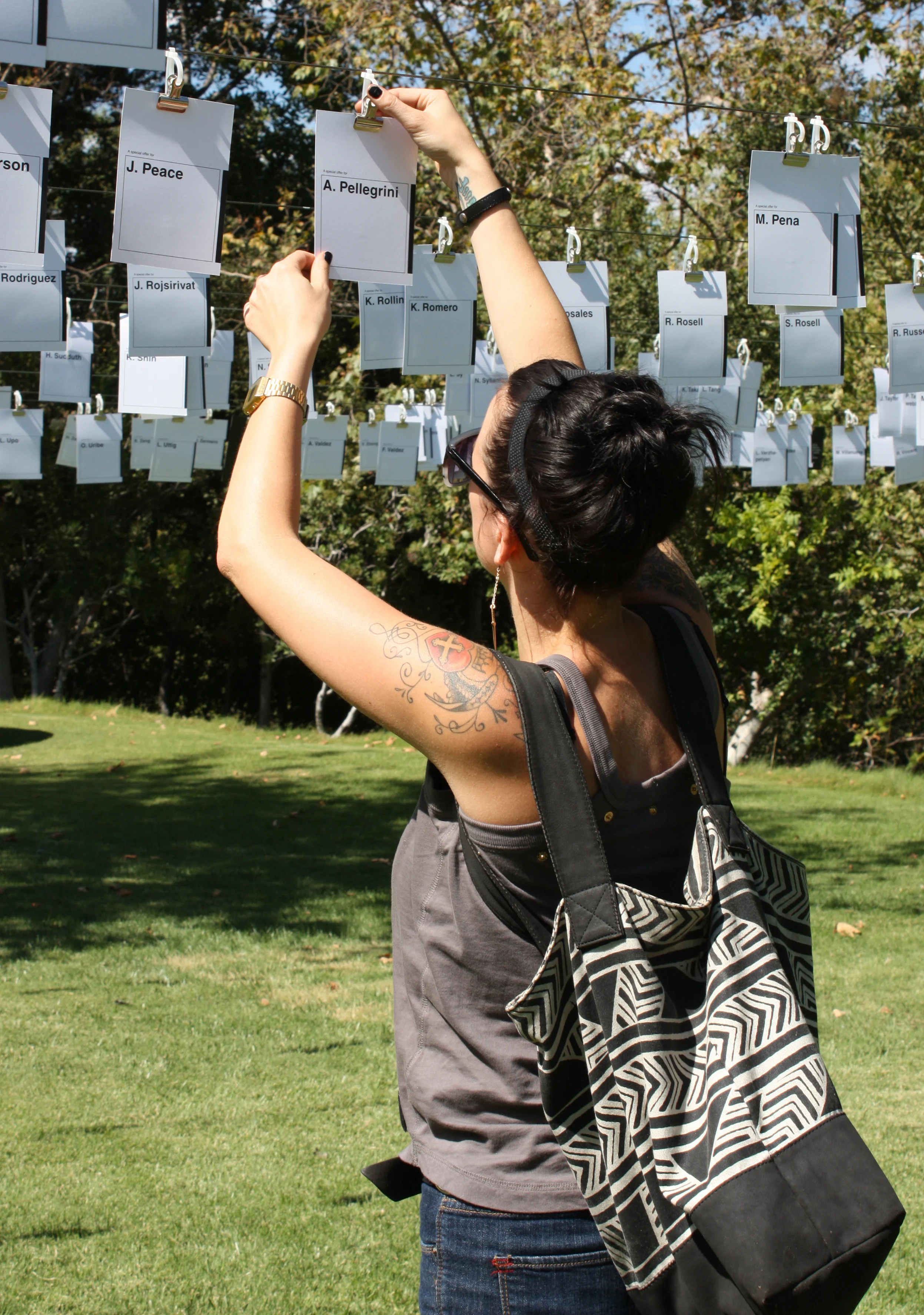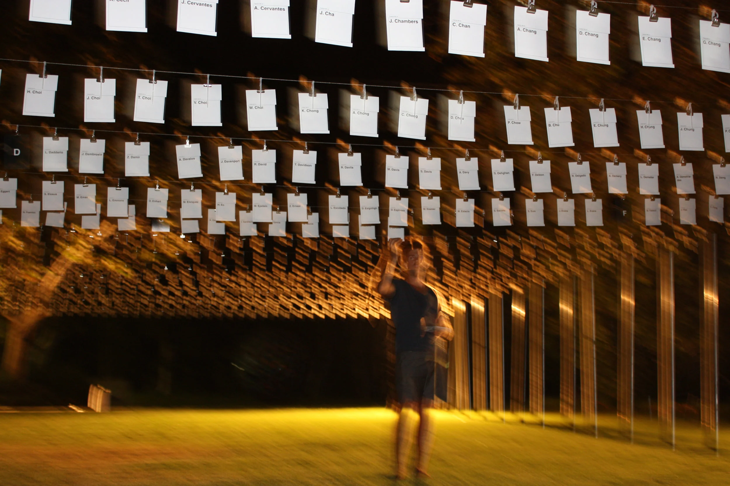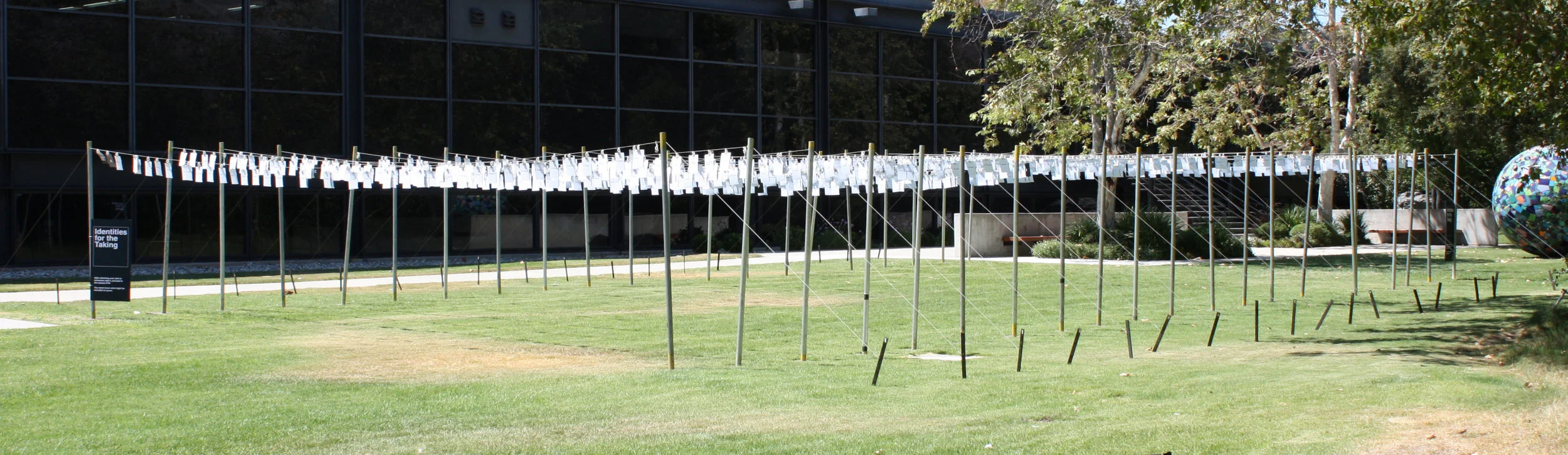 The cards were presented alphabetically in 20 rows at a height of about 6'4", and students were encouraged to find their own names or take whoever else's. The cards were neatly offset at 8" on center until the wind did its damage and students began sifting through them. Total dimensions were about 30 x 64 x 6 feet. The installation took 3 days and a team of 5 (including myself) to assemble. The installation was featured August 15 - 18, 2010.