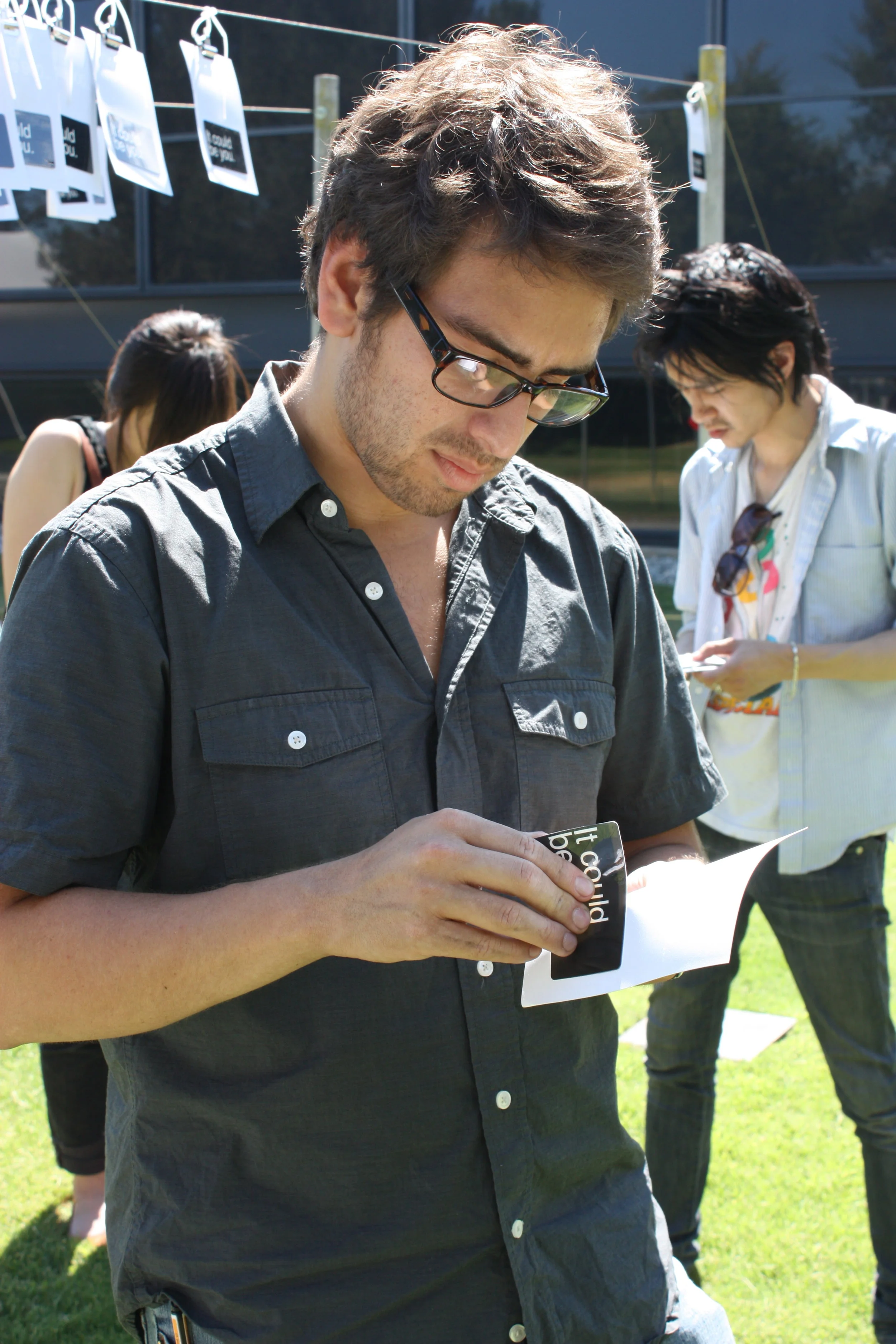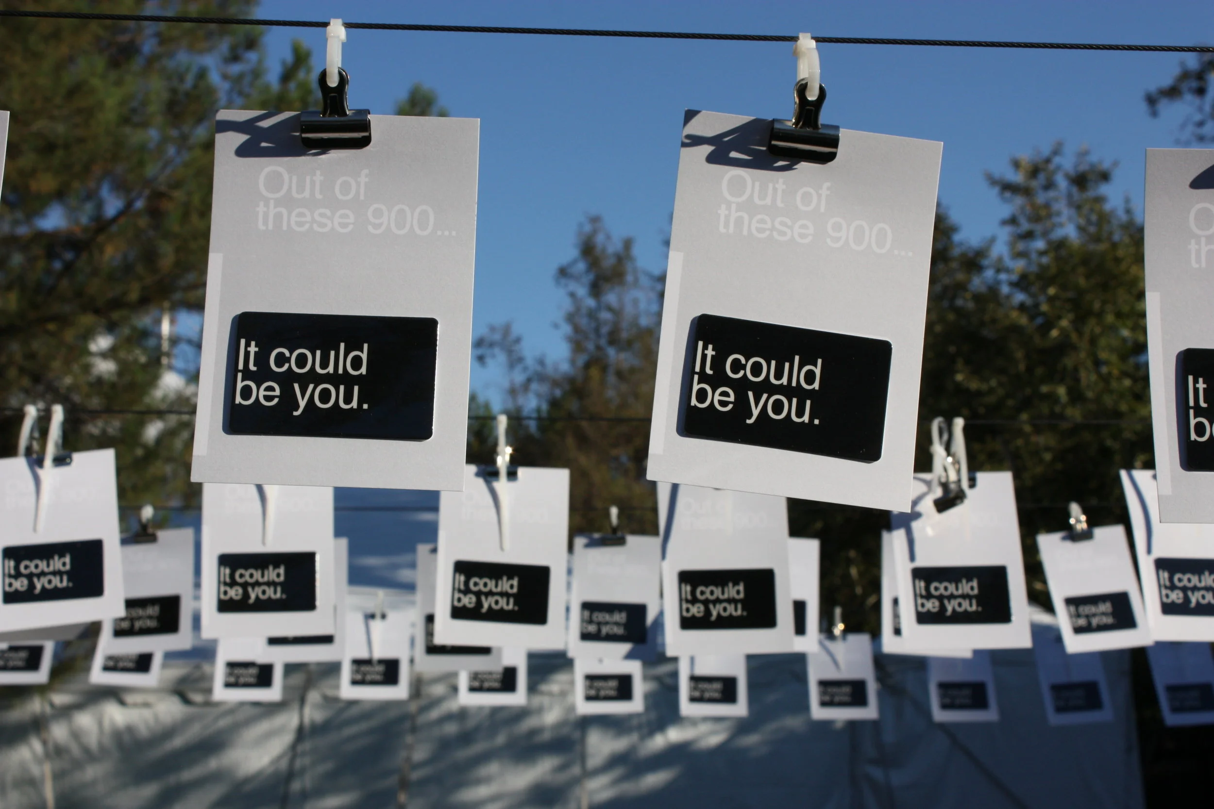 I designed and printed 900 "promotional" postcards, each featuring an arbitrarily chosen student's name. A random 20 percept sampling of each alphabet "group" (last names A-Z) were chosen from the student directory. 900 was chosen as an overwhelming sampling of the 'hypothetical' identity thefts occurring in just one hour. The catch phrase on all the postcards was "Out of these 900" ... "It could be you." Attached to the back of each postcard was a credit card (magnetic swipe card) with the student's email and major encoded. The cards are indeed swipe-able, but the information is only accessible by a 3-track card magnetic Card reader.