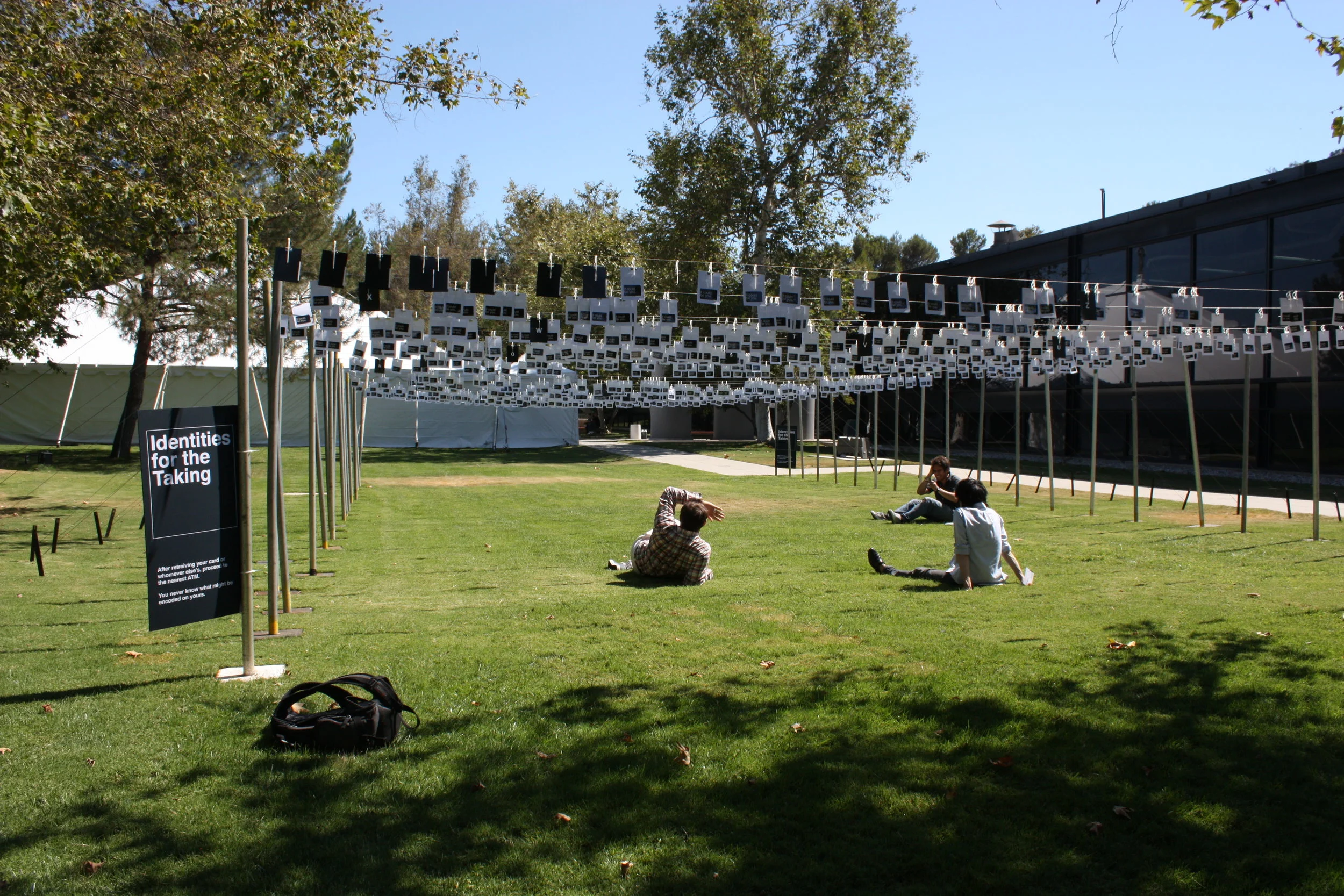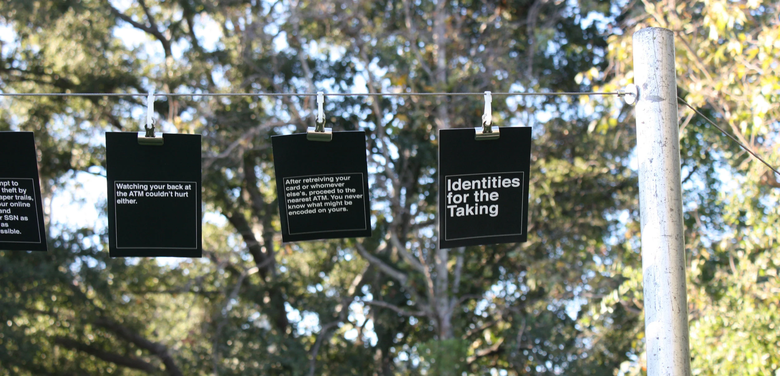 Identities for the Taking was an installation I designed and fabricated at Art Center College of Design in 2010. The driving notion of the project was to transform data into information in a way that demands interactivity from a passerby, generates a participant out of a viewer, and moves him or her to action. The topic chosen was identity theft, and the data was that an identity is stolen every 4 seconds in the US; in other words 15 identity thefts occur per minute, 900 thefts per hour, and 21,600 per day.
